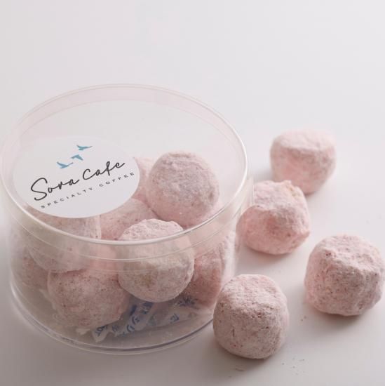 卵を使わず、仕上げに粉糖をまぶした、スノーボールと呼ばれるサクサクホロホロ食感のクッキー。 甘酸っぱいフランボワーズのフレーバー。 賞味期限:発送から約1か月