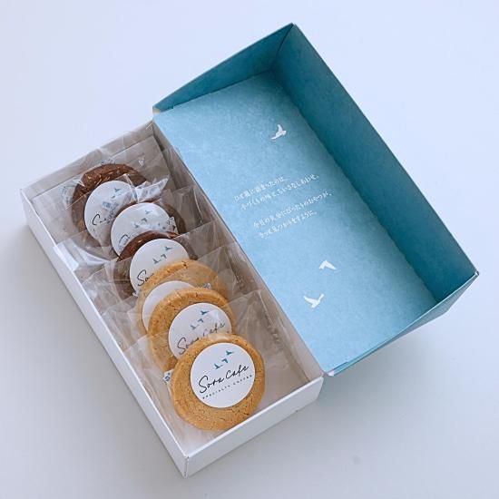 2つの味が楽しめるクッキーの詰め合わせ。 ちょっとした贈り物にも。 SORACAFEのスイーツはすべてパティシエの手作り。 1つ1つ試行錯誤を重ねて優しい甘さのスイーツに仕上がっています。 【塩バニラ】 3枚 バニラの香りとほのかな塩味で甘みを引き立たせました・ 【チョコ&ナッツ】 3枚 カカオ香るクッキー生地にアーモンドをたっぷりと。ザクッサクッとした食感も◎ 賞味期限:発送から約25日 ギフト:Soracafeオリジナルの箱。(包装なし)熨斗不可